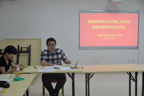 大学生第二党支部在党团活动室举行预备党员转正支部大会。会议主要议题是讨论唐亚东、马娜等8名预备党员同志的转正问题。本次会议应到23人,实到20人,由支部宣传委员毛培文主持会议。