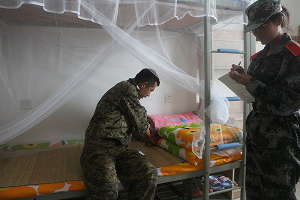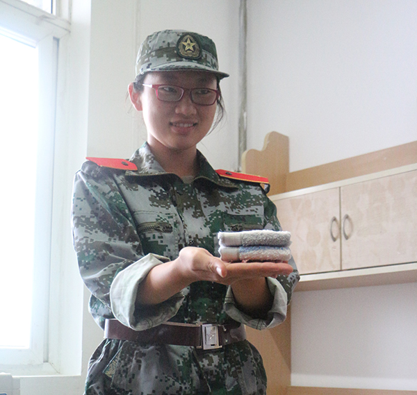 内务整理完毕后,小葡萄们整齐地、训练有素地依次站在各自寝室门口,怀揣着紧张而又激动的心情等待着教官的检查。尽管在检查过程中,教官毫不客气地指出内务的不足之处:军被摆放不够规范,毛巾没有叠成“豆腐块”状,桌面上的水渍没有擦干,地上隐藏的头发丝……但“铁汉柔情”却也名副其实,教官们在严格要求、苛刻检查的同时,也悉心教学、细心指导:为同学们重复示范被子、毛巾的叠法,亲自抚平床单上的褶皱,蹲下身来检查床下鞋子和脸盆……他们在检查内务过程中所流露出的专业、专注,无不让人受教于军人严谨认真的工作作风和人生态度。与此同时,小葡萄们也无不认真仔细地看着、听着、记录着,始终保持着谦逊、谨慎的态度。
