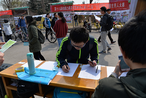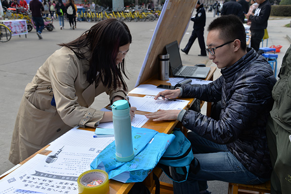 学生代表集合完毕,“金话筒”大赛线下报名活动于西雕广场正式开始。在团工委书记赵星宇的带领下,学生代表纷纷展现自己特长,为宣传“金话筒”大赛作出突出贡献。王若禹同学用自己娴熟的播音技巧朗读着妙语生花的演讲稿,用实力与播音的魅力吸引来往的西农学子关注并参与“金话筒”大赛。与此同时,马文勃同学妙语连珠,出口成章,通过派发宣传单时与同学们的简单接触,吸引数十同学报名走向播音之路,突破自我。两个小时转瞬即逝,报名表上满满的名字代表着宣传工作的成功。