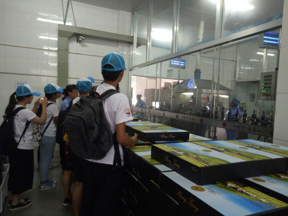 国宾酒庄是世界上第一座中式唐风酒庄,融合了大唐文化和葡萄酒文化。建筑汇聚了中国古典园林的精华,完美再现了盛唐的时代精神和审美情趣,是中国个性化、特色化、高端化葡萄酒庄的优秀代表之一。由于之前已与相应工作人员取得联系,队员全部到达后,便直接进入灌装车间参观学习。在工作人员的讲解下,队员们了解到,该条生产线由灯检、冲瓶、灌装打塞、套帽、再次灯检、贴标、喷码、装箱等组成,其中灌装打塞是酒的整体品质形成中比较关键的一步,相应岗位也被称为关键控制点,不同于中粮长城(烟台)葡萄酒有限公司的高自动化灌装线,国宾酒庄的灌装线与其酒产量相适应,自动化程度并无需过高,加深了队员们对灌装线的了解,燃起了队员们内心的学习热情。