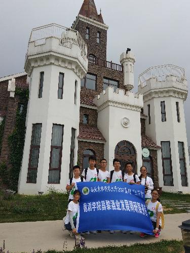 昌黎酒业发展调研队在仁轩酒庄标志建筑物前合影