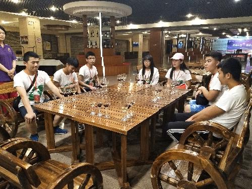 小队成员在工作人员的带领下进入了紫轩酒庄,紫轩作为国家4A级工业旅游景区有着一套系统的参观路线,还配备会员制小型高级休闲会所、主题休闲区、专业地下酒窖和鉴赏中心等特色功能区。酒庄的大门前有以欧洲小镇的建筑风格为蓝本的喷泉,绕过喷泉走进有葡萄藤装饰的走廊就正式的来到了紫轩的内部了。带上贵宾证,走进紫轩,小队的大家内心里兴奋不已。