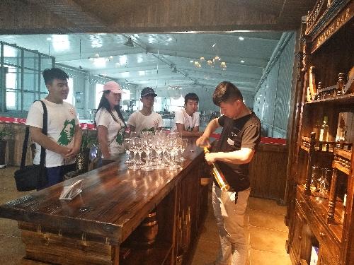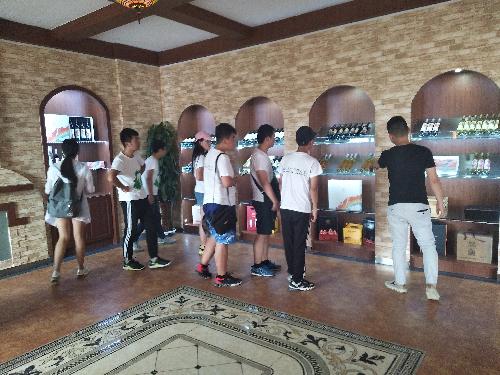 红桥庄园的工作人员对我们的到来表示热烈欢迎,首先带我们参观并介绍了酒庄的基本情况。红桥庄园的运营方式为葡萄酒酿造出售和旅游相结合,其酿酒的葡萄也是自己种植,采用人工采摘的方式,这里建立了儿童乐园,可以进行烧烤,钓鱼等休闲娱乐活动。在品尝了红桥酒庄的半干赤霞珠、半甜美乐等葡萄酒之后,大家跟随着工作人员的脚步,来到了地下酒窖以及生产车间。简单了解了红桥庄园葡萄酒的生产流水线——先根据葡萄成熟度决定是否采摘葡萄,然后负责生产,酿造,收回葡萄,压榨处理装瓶一系列工作,就可以出售葡萄酒了。至此,为期两天的调研已悄然接近尾声。接下来我们对酒庄资历较深的老师傅就红桥酒庄的特色、葡萄酒酿造方式、优势、发展前景等方面进行了采访,了解到红桥精品酒庄将根据葡萄酒的销量来决定是否扩建,在发展葡萄酒行业的同时致力于打造一个3A级景区。最后,酒厂工人就葡萄酒专业发表了自己的看法,和队伍成员交流了自己的经验,并对队伍成员的未来发展提出了中肯的建议。