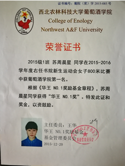个人简介:大家好,我是葡酒1501的苏周晨星。现是省级科创项目的一员,并任校大学生艺术团阮乐团团长。对于我来说,大学生活=学习+实验+音乐。在大学的两年多时间里,我有获得优秀团员、优秀团干、专业奖学金,有参加新生运动会而有幸申请到了“华王NO.1”,也有去新加坡参加音乐比赛获得金奖。其中想跟大家分享的是“华王NO.1”奖、一张优秀志愿者的证书以及在音乐方面收获的一份奖状。