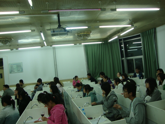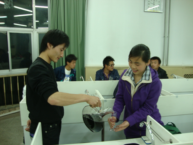 品尝室举行了品酒活动。 本次所品尝的三款干红分别是来自智利Rapel山谷2007年份的梅鹿辄,澳大利亚红马庄园2004年份的西拉以及智利中央山谷2008年份的赤霞珠。另外还给大家提供了黑加仑干以及奶酪。 本次活动主要是让同学们感受三种最经典的干红品种,梅鹿辄被誉为红葡萄的公主,西拉被誉为红葡萄中的王子,而赤霞珠则被誉为红葡萄品种之王。通过品尝三种葡萄酒,了解三种葡萄所散发不同的味道以及不同口感。 本次活动从7:30持续到9:30。工作人员首先给大家分别讲解了三种葡萄品种的外形、生长条件、生长状况、特征香气等特征,使同学们对三种名贵葡萄品种有了初步的认知。随后大家分别品尝了以上3款酒,同学们边品尝,边看ppt中相应葡萄的特点,对酒的特点进行深入了解。最后,会员们根据自己的感受填写了葡萄酒品尝描述记录表,并进行了广泛的交流。 最后我们对征集到得品酒俱乐部LOGO进行了投票,来自09级徐思思的作品最终被确定为俱乐部LOGO。