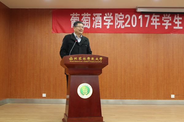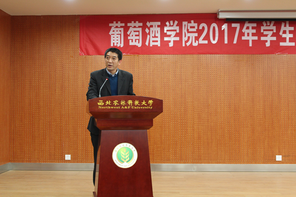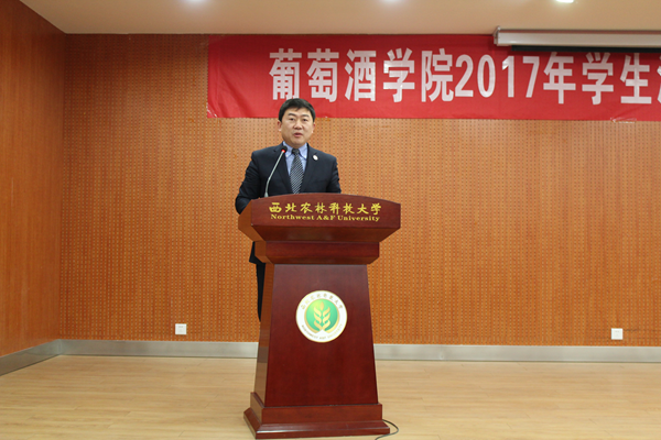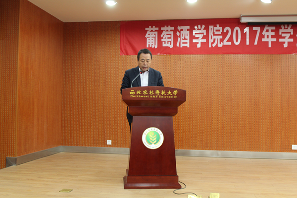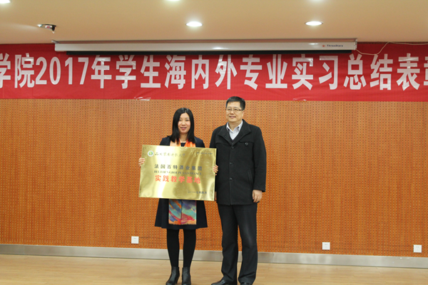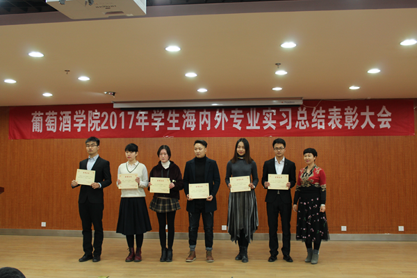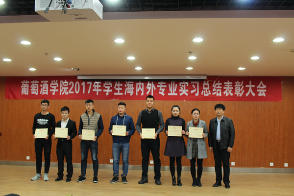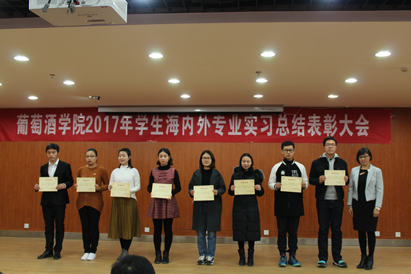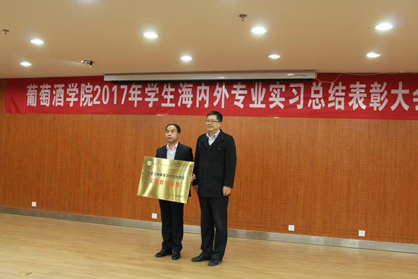 党委副书记邓亚丽宣读《关于表彰2017年葡萄酒工厂生产实习优秀实习生的决定》后,教务处副处长李菊兰、就业指导中心副主任罗建峰、国际合作与交流处副处长于瑛分别为优秀实习生颁发证书;副校长罗军为宁夏张裕摩塞尔十五世酒庄、法国百特酒业集团成为西北农林科技大学实践教学基地授牌。