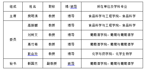 研究生:胡凯 学科专业:葡萄与葡萄酒学 论文题目:葡萄酒混菌发酵的酵母互作及产酯调控研究 时间:2019年10月9日15:00 地点:马会六合彩 六楼党团活动室 答辩委员会组成: 马会六合彩 2019年10月6日