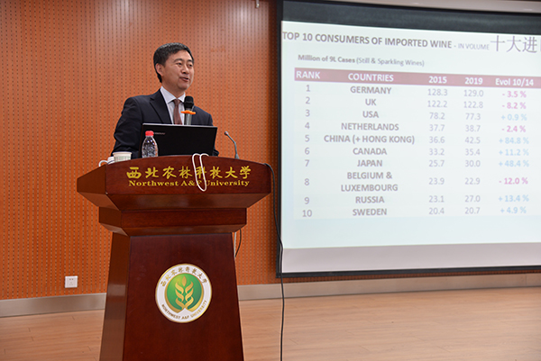 李德美老师本次讲座,带来的不仅有自己从业20余年的经验,还有自己对关于葡萄酒行业,尤其是中国葡萄酒行业未来发展的评估。讲座内容共分四个方面,首先是由李老师分析世界葡萄酒生产贸易与消费格局、中国葡萄酒产业现状以及中国葡萄酒市场的特殊性三个方面的内容,之后是李老师对自己择业、从业、坚持到现在的过程中的经验分享以及与学生之间的问题互动。在前三个内容上,李老师基于世界葡萄酒产业的发展现状,对未来葡萄酒市场发展做了初步的判断。在葡萄酒消费方面,他为在坐师生展示了大量的涵盖葡萄酒种类和葡萄酒颜色分类的世界各国消费数量的对比数据,对世界各国葡萄酒进出口贸易进行了详尽的分析,在坐师生或是拍照、或是记录。在分析中国葡萄酒产业现状时,李老师尤其介绍了澳大利亚葡萄酒在中国市场已达第一位的所占比重,引人深思。之后,他所介绍的中国葡萄酒市场的特殊性,则建议若是要在中国进一步发展葡萄酒产业,所生产的产品要和中国的地域性相契合,所宣传的内容也一定是接地气的、与人们日常生活、文化活动相关的品牌。中国葡萄酒的从业者和投资者也应该扩大本土优势,抓住发展机会,拓宽中国葡萄酒消费市场。