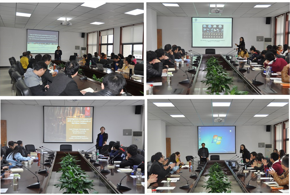 师生带来了精彩纷呈的学术报告。首先,姜娇讲了题为“Use of directed evolution to generate multiple-stress tolerant Oenococcus oeni for enhanced malolactic fermentation”的报告,她围绕实验背景、目的、方法、结果等方面进行了详细的介绍,对未来的研究方向提出了建议。王家明着重介绍了其参与建设的数学模型估测葡萄采收期和价格的体系,并表示对我国宁夏产区建设相应体系的抱有很大希冀。最后,高金珊围绕“大豆类胡萝卜素裂解基因GmCCD4的克隆及功能分析”进行了简单汇报,介绍了通过分子水平的研究生产处大豆新品种的方法,并与参会师生探讨了通过基因水平改造葡萄,生产葡萄新品种的可能性。