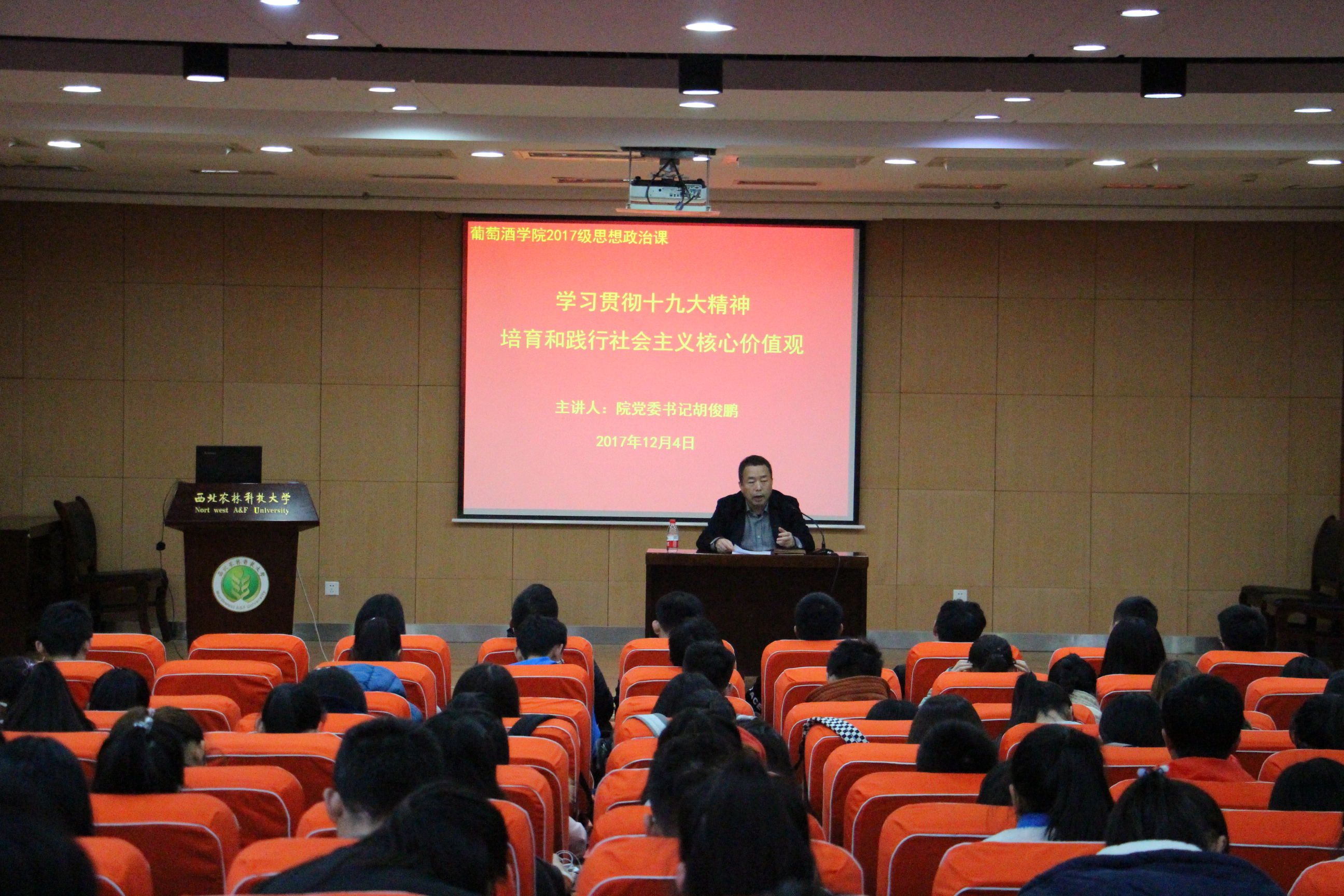 党委书记胡俊鹏在北绣北报告厅为2017级全体新生作题为《学习贯彻十九大精神,培养践行社会主义核心价值观》报告,报告会由辅导员朱美蓉主持。