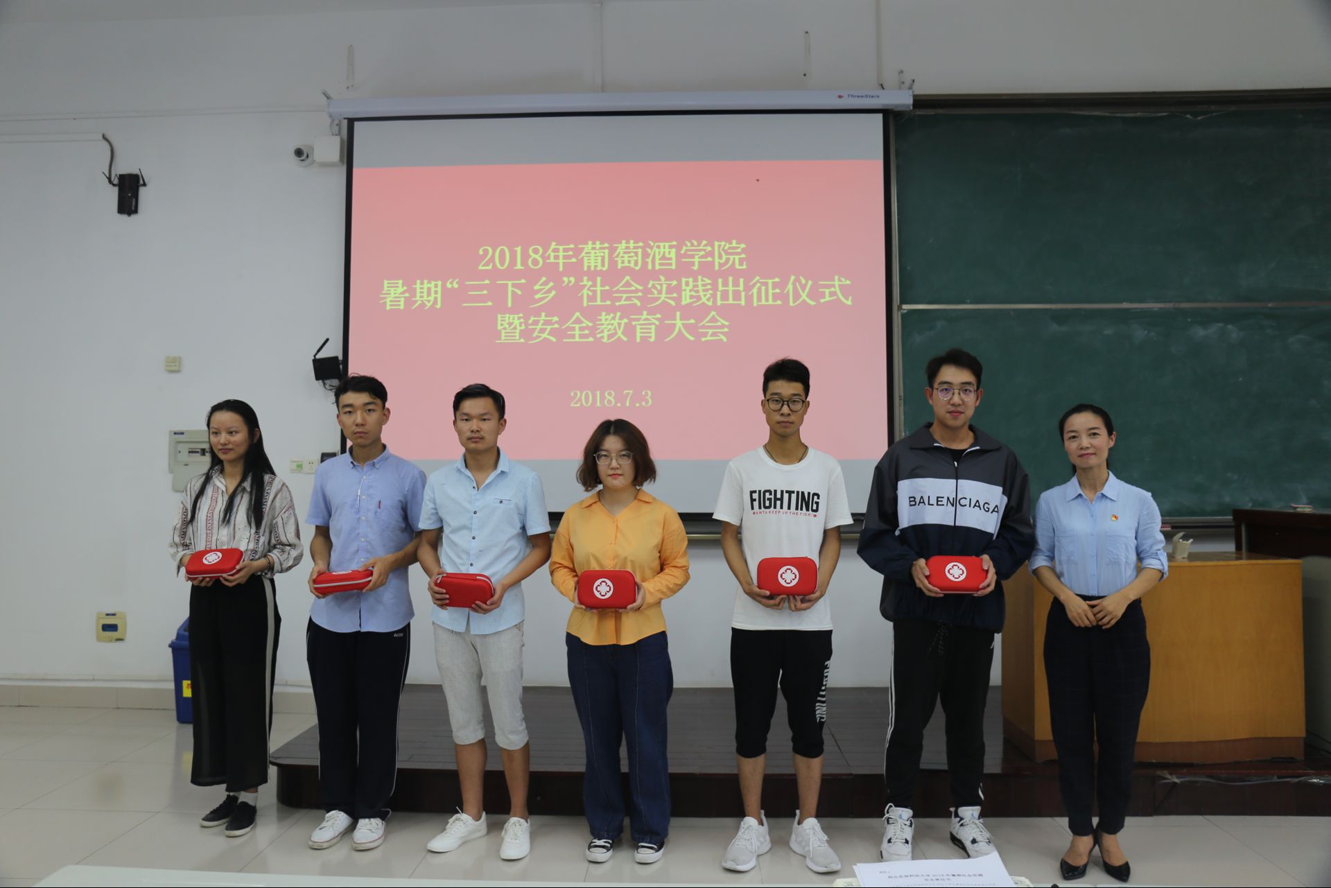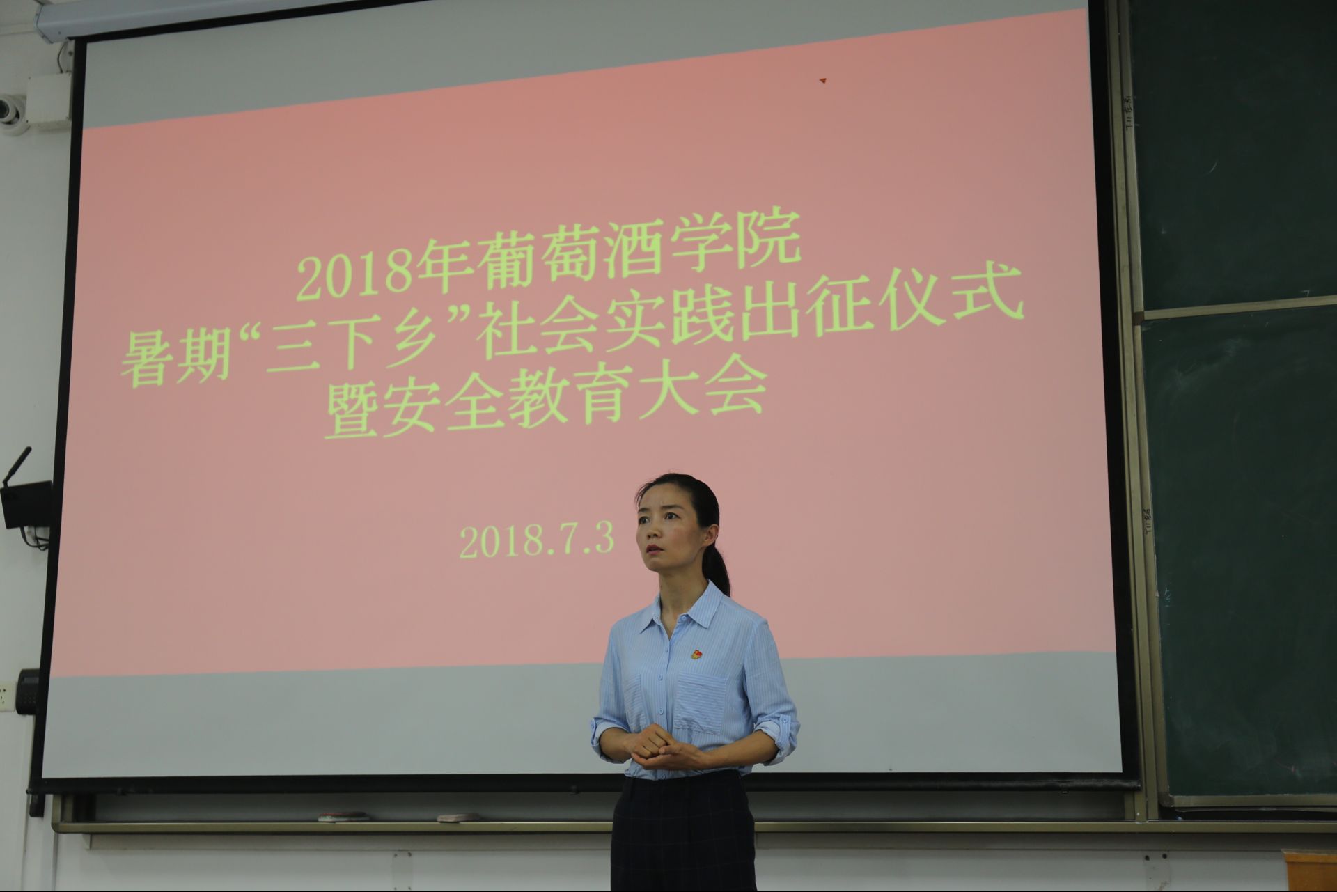 举办2018年大学生暑期“三下乡”社会实践活动出征仪式暨安全教育大会。党委副书记邓亚丽,分团委书记赵星宇,辅导员朱美蓉以及全体暑期“三下乡”社会实践团队成员参加大会,会议由赵星宇主持。