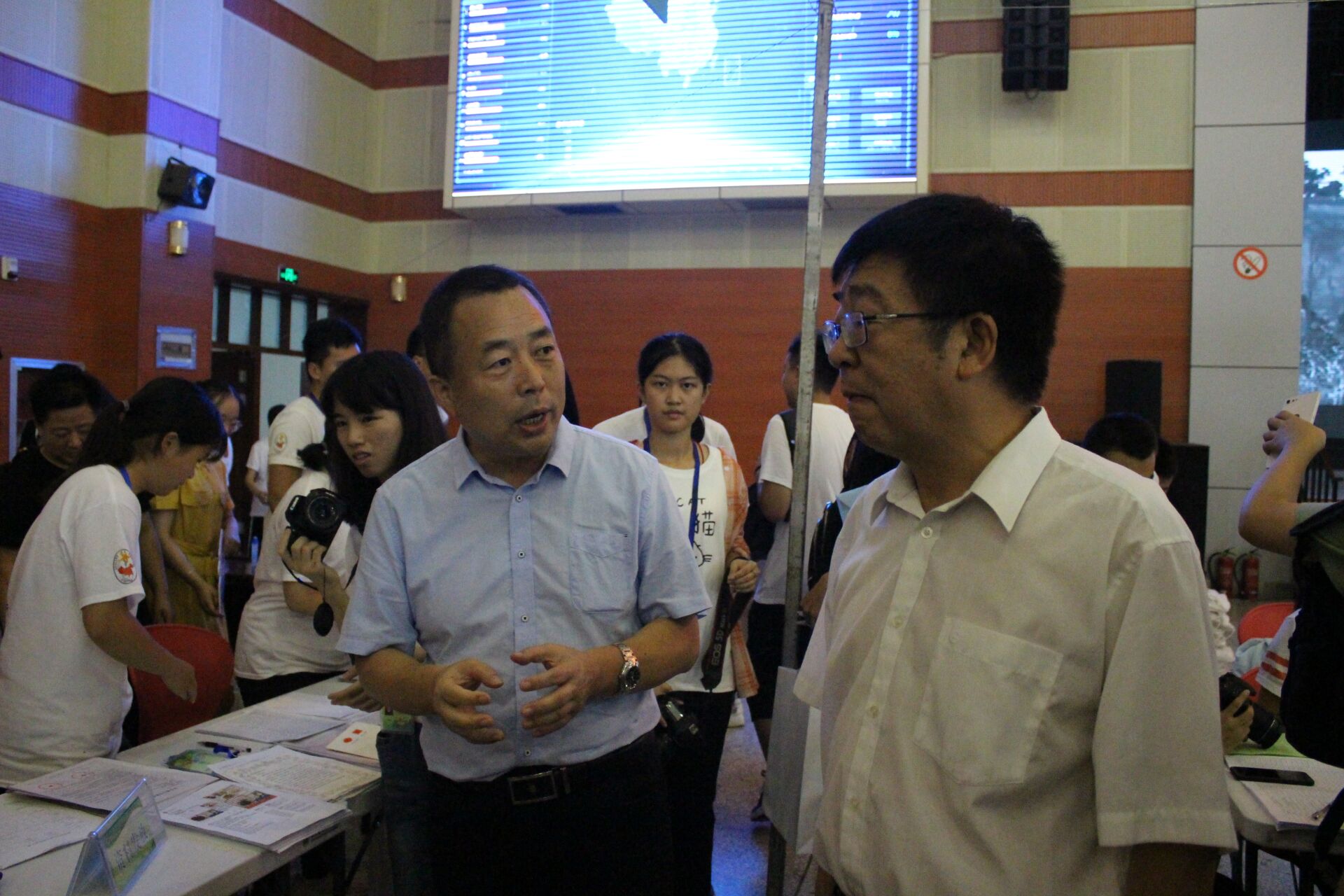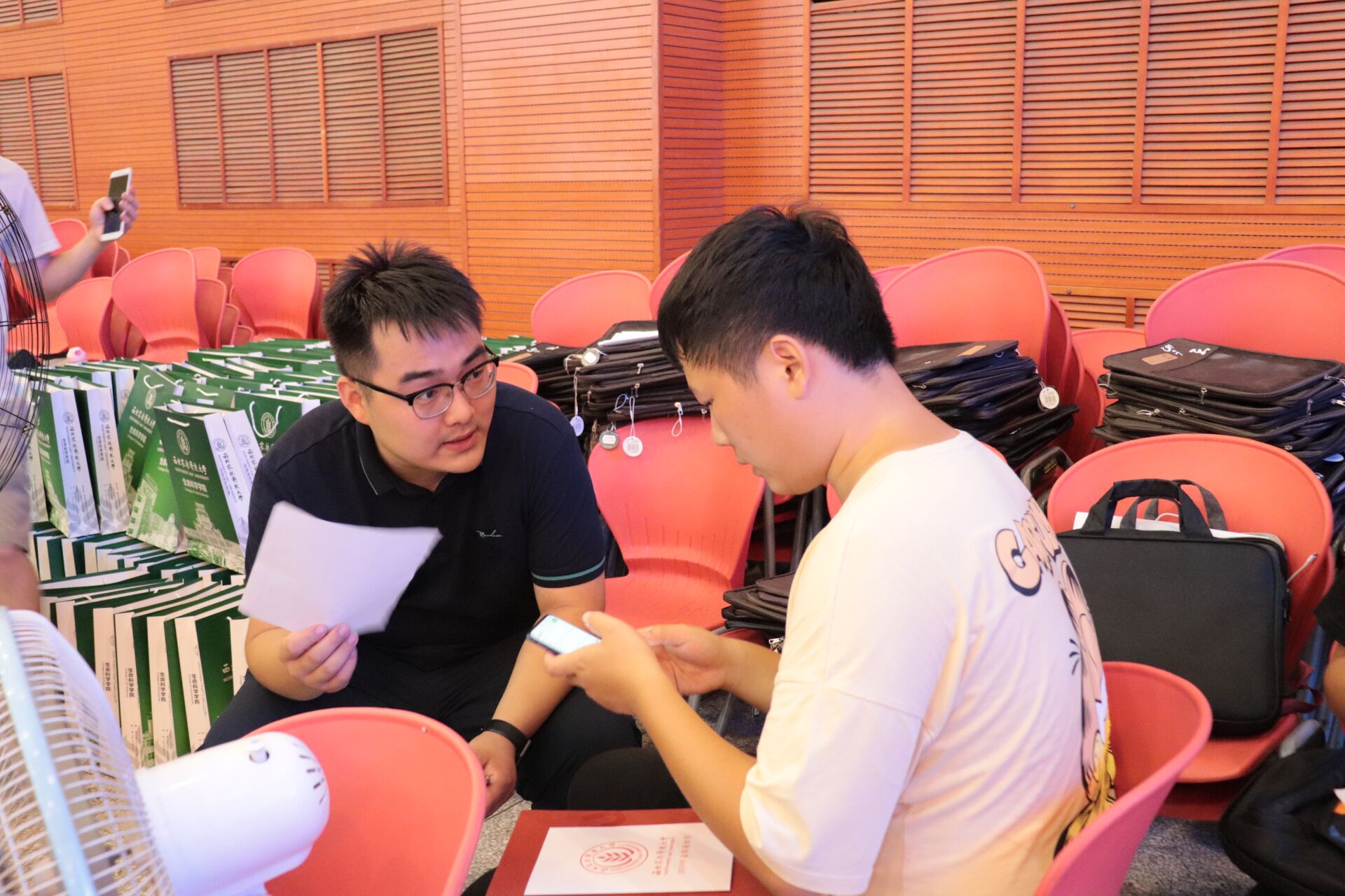 宿舍有迎新志愿者协助宿管阿姨帮助新生办理入住,许多家长都在仔细阅读马会六合彩