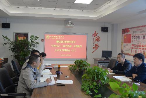 全体领导班子参加学习研讨,党委书记胡俊鹏主持会议。 刘旭和胡俊鹏分别领学了《习近平关于“不忘初心、牢记使命”论述摘编》第一章、第四章,并围绕“新时代如何加强党性修养,牢记办学初心使命”及“坚定理想信念,增强党性修养,牢记办学使命初心”做重点发言。