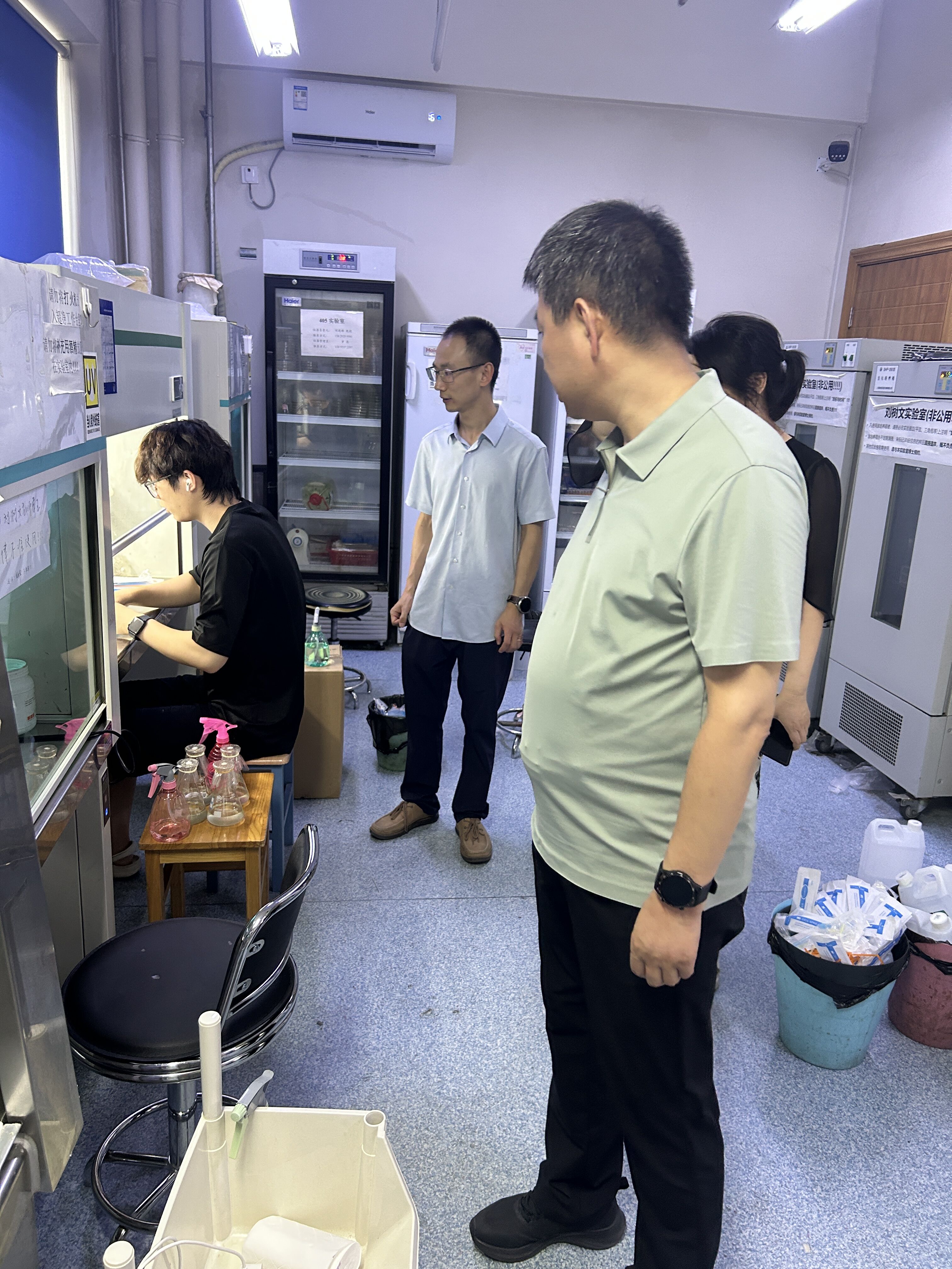 学校检查组重点检查了实验室危化品、特种设备、实验室消防设施安全及水电安全等情况,尤其对前期检查发现的未整改到位的实验室,逐条查看询问原因,对其隐患整改进行指导并提出要求。